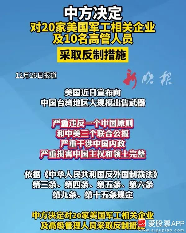 原因是题材好,又是商业航天,又是卫星互联网,又是国产芯片,难怪股价这么猛!但出来混总要还的,下周一不会20cm跌停吧。 4、外交部:对20家美国军工企业及其高管进行制裁 盘后外交部宣布,对20家美国军工相关企业及10名高级管理人员采取反制措施。这一行动是对美国近期向中国台湾地区大规模出售武器的有力回应,彰显了中国在核心利益问题上的坚定立场。 点评:今天直接放大招反制了,对美国20家涉台军售企业实施制裁。直接诱因还是老问题:老美又在台湾问题上踩红线了,我们必须打回去! 这些企业包括洛马、波音等,一边在中国赚着大钱,另一边转头就给湾湾送武器。这就是典型“吃中国的饭,砸中国的锅”,天底下哪有这么便宜的事?