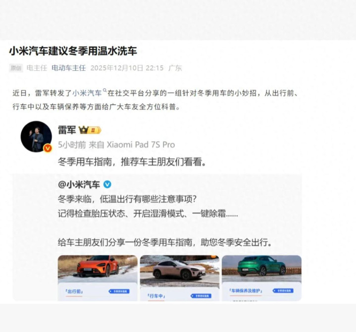 事情的起因很简单:小米汽车在社交平台分享冬季用车小贴士,涵盖出行前检查胎压、开启防滑模式,以及车辆保养里的 “温水洗车” 等内容,雷军随后转发推荐车主查看。但 “温水洗车” 这一条,偏偏戳中了不少用户的日常痛点 —— 冬天谁有条件专门烧温水洗车?普通车主要么路边洗车间冲一下,要么自己接冷水擦,“温水洗车” 听起来更像 “精致车主专属”,和大多数人的实际用车场景完全脱节。